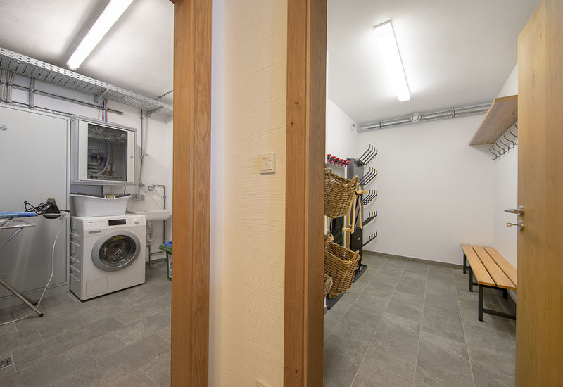 Den Technikraum mit Waschmaschine, Trockner und Bügelstation, sowie einen großzügigen Eingangsbereich.